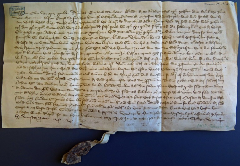 Urkunde vom 14. Februar 1400, aufbewahrt im Thurgauer Staatsarchiv, Frauenfeld unter der Referenz StATG 7'47'0. Eine pdf-Kopie der Urkunde steht auf der Download-Seite zur Verfügung.
