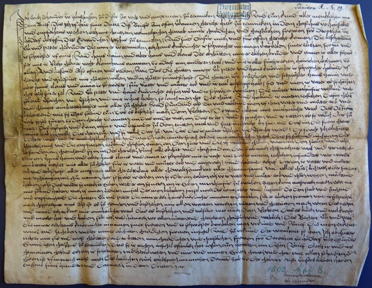 Urkunde vom 8. Mai 1503, aufbewahrt im Thurgauer Staatsarchiv, Frauenfeld unter der Referenz StATG 7'47'37. Eine pdf-Kopie der Urkunde steht auf der Download-Seite zur Verfügung.