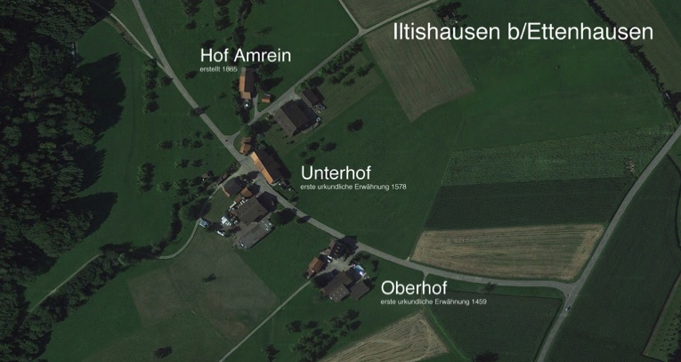 View on today's Iltishausen. With the exception of Amrein's farm, built in 1865, Iltishausen did practically not change since the Middle Age. Easy to identify is the Oberhof and Unterhof of Iltishausen established in 1459 and 1578 respectively.