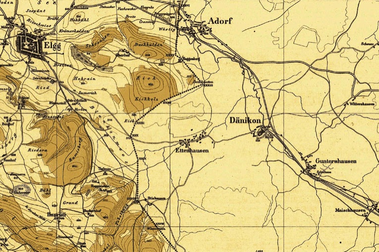 Clearly recognisable is the monastery of Tänikon (Denicken), Ettenhausen (Ettenhusen), Iltishausen (Iltishusen) und Aadorf (Aadorff). It is also interesting to notice that in those times Ettenhausen and Iltishausen were of about the same size.